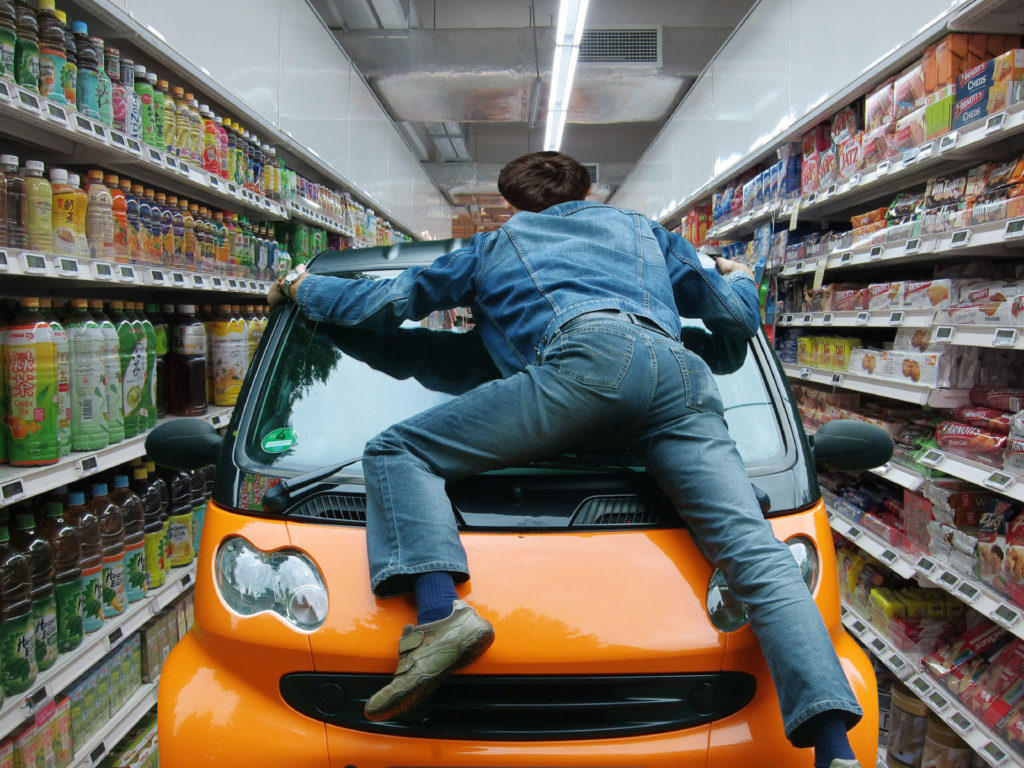 De plus au bout d’à peine une minute à essayer de forcer le passage au milieu des clients avec leurs caddies, les vigiles font leur apparition, visiblement très contrarié par Alain, qui pourtant pensait être dans son bon droit. Mais Alain ne cède pas totalement a l'intimidation, il gare alors sa voiture sur le parking et entre dans le magasin pour voir cette fameuse transformation en "drive".